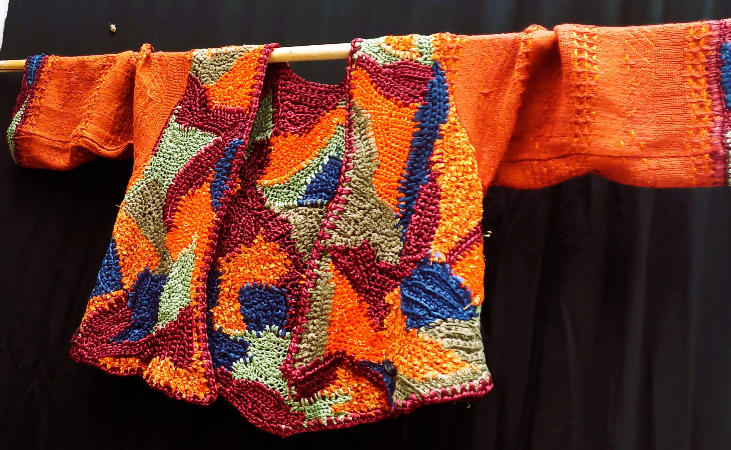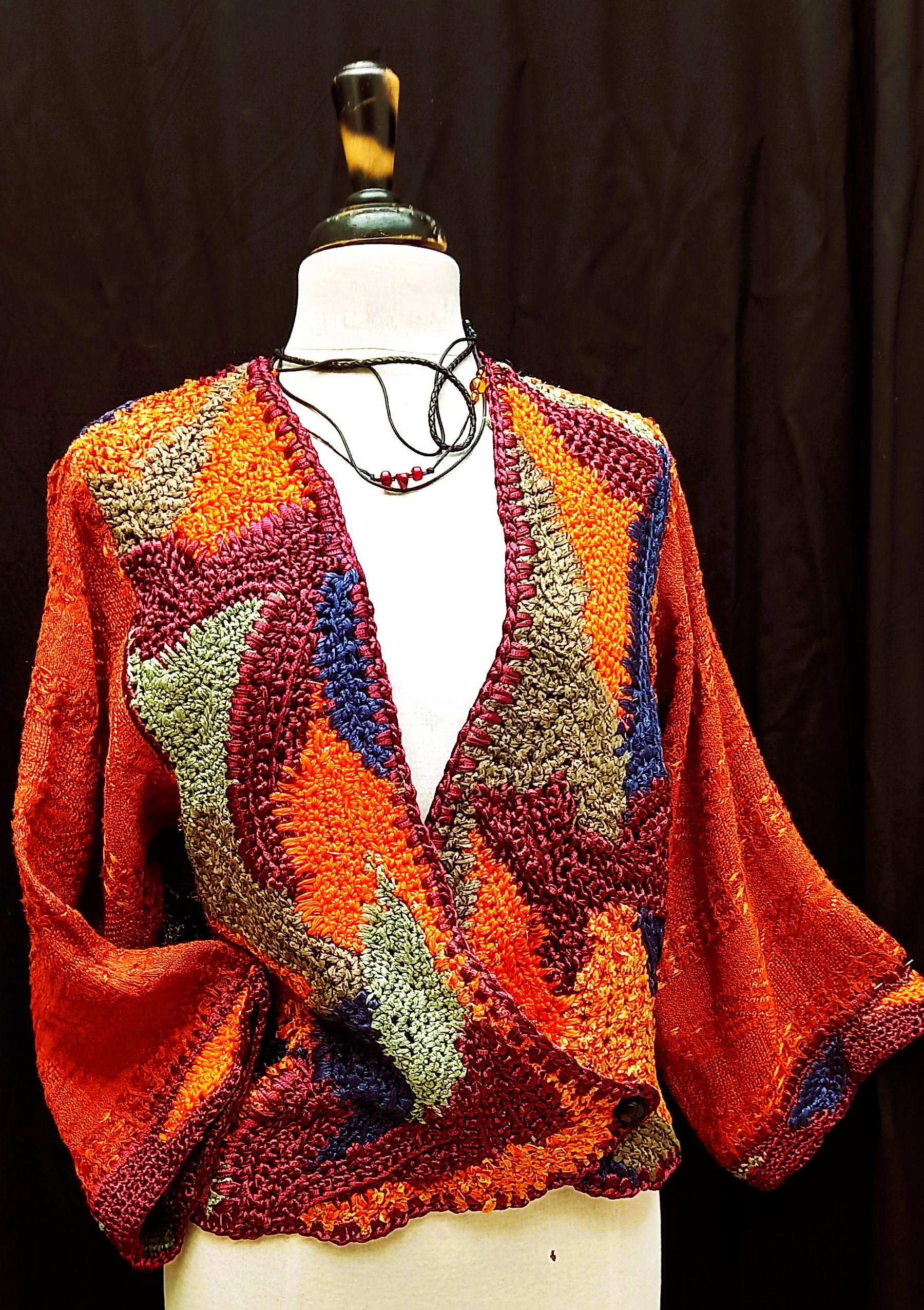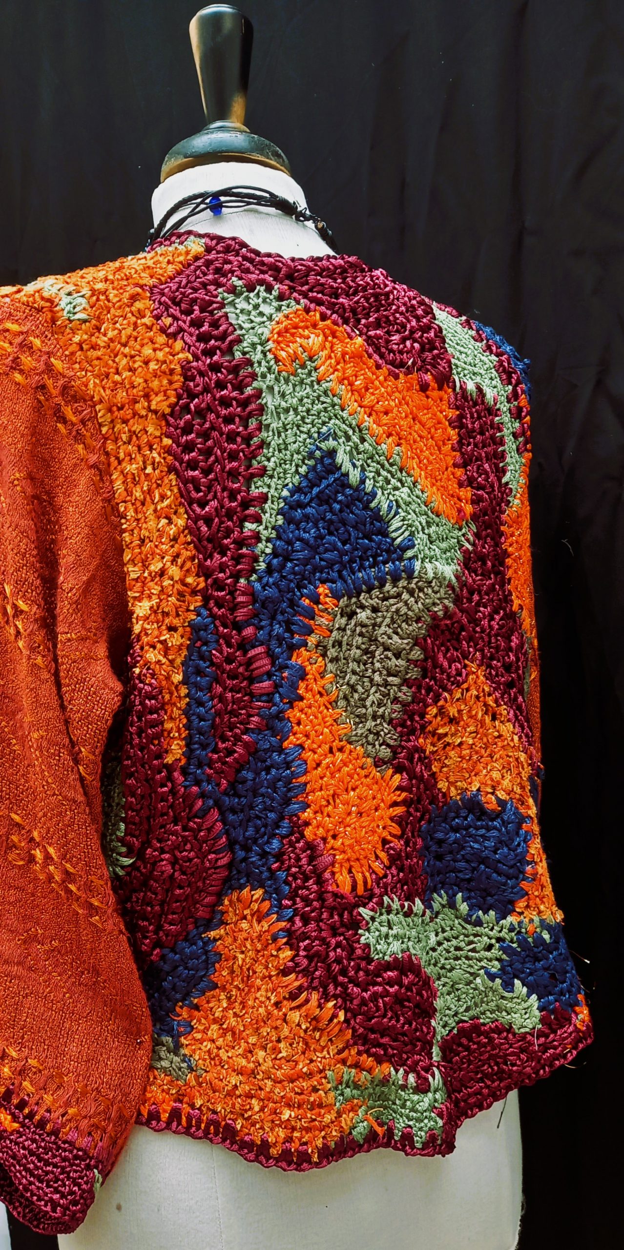Alda…is a stupendous one-of -a kind free form crochet TV jacket,with an irregular hem, created from various viscoses and cotton yarns. The kimono sleeve is a burnt orange ,handwoven viscose cotton with handfinishing.The jacket is doublebreasted with a V-neck.