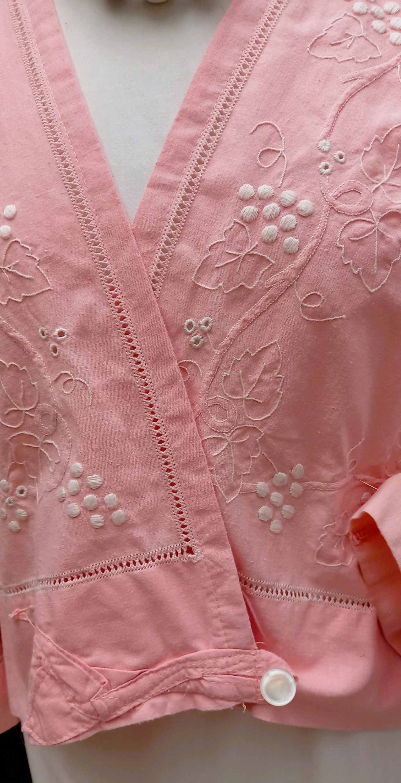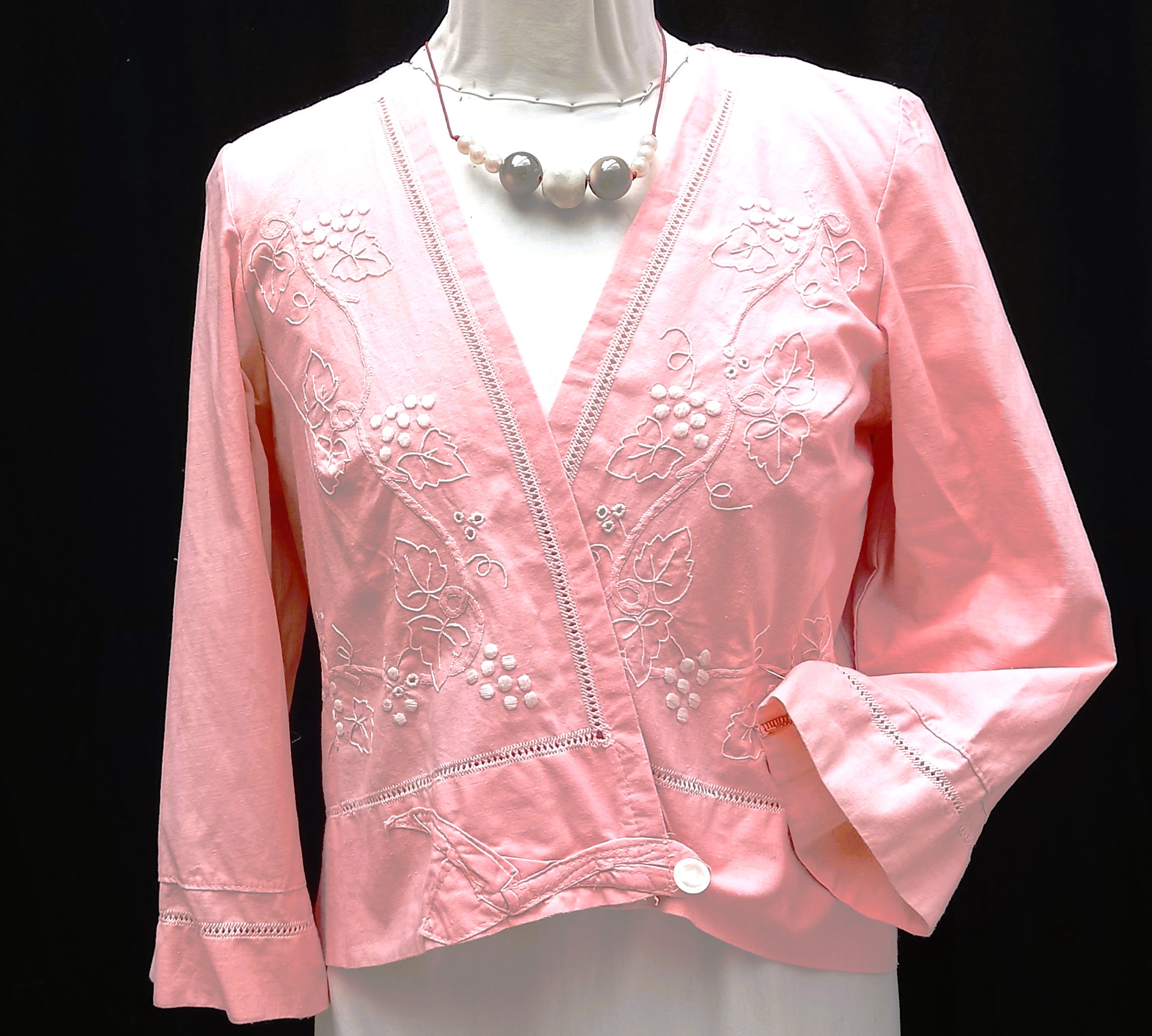 Bernie…is a short cross -over jacket , a compliment to “Barbie”. It is 100% cotton with a floral embroidery motif in the front