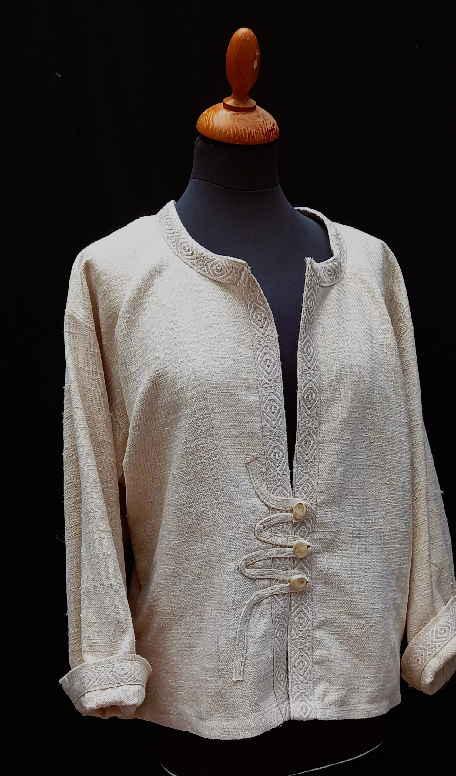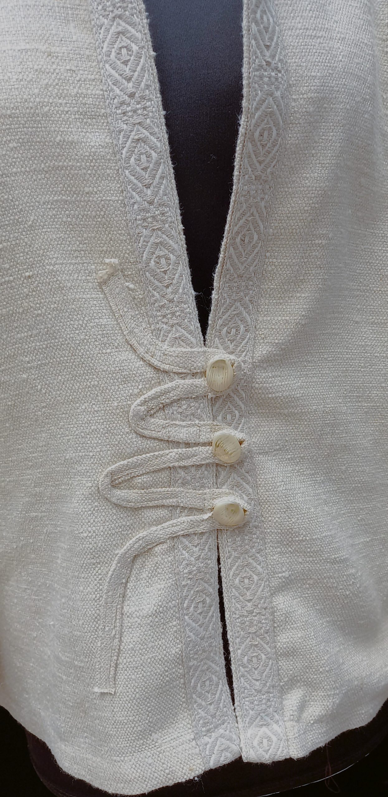 Bianca…is an off white 100% silk linen jacket . The elegant jacket with Kimono sleeves has a woven trim and a 3 button closure. The vintage buttons are genuine mother of pearl