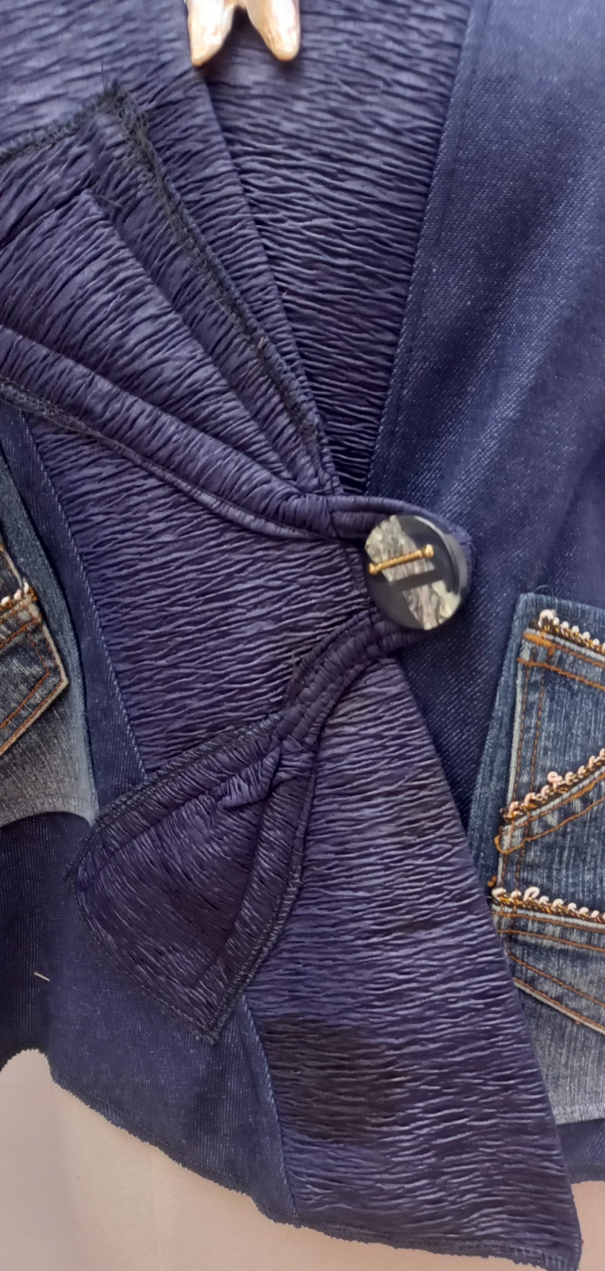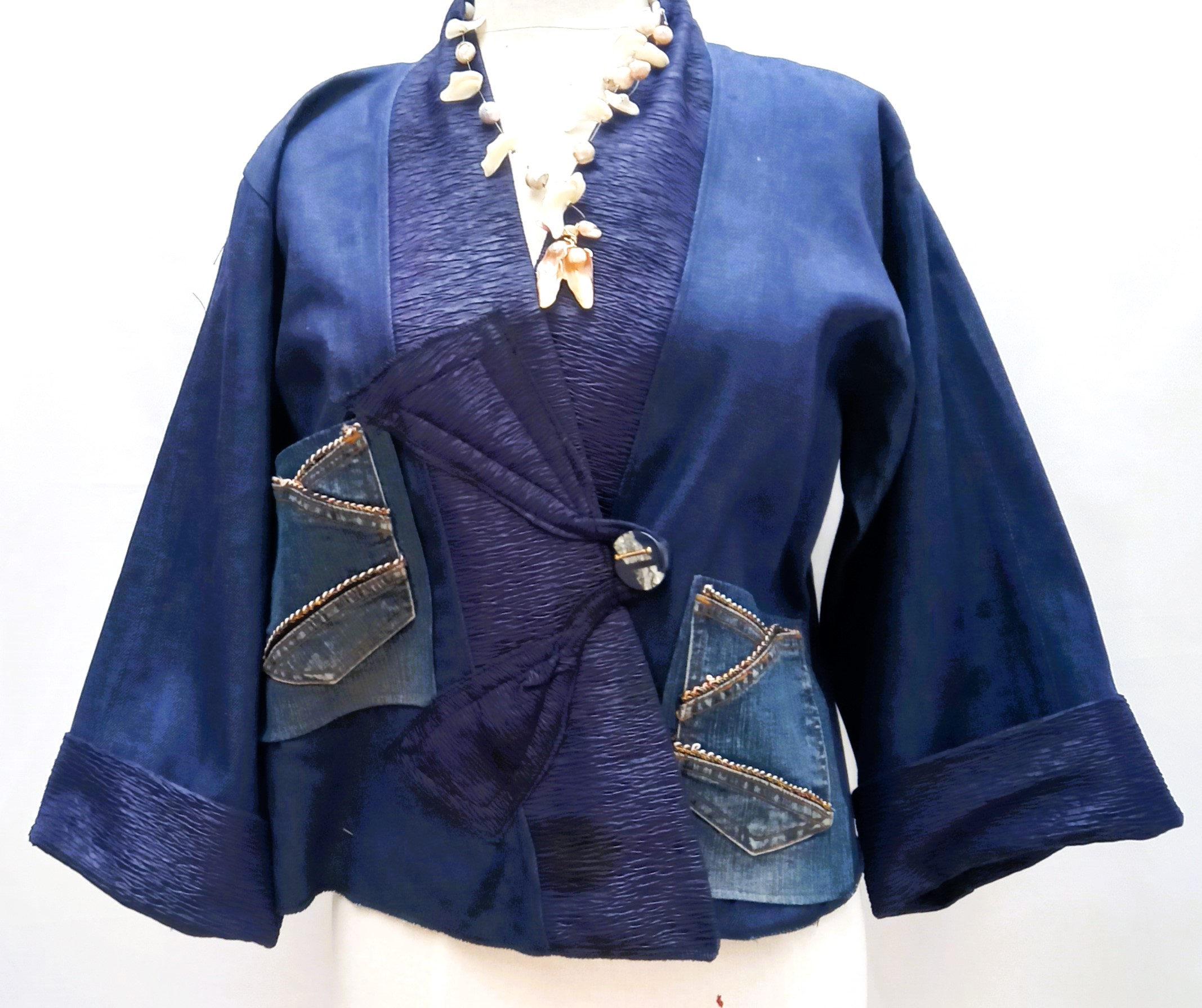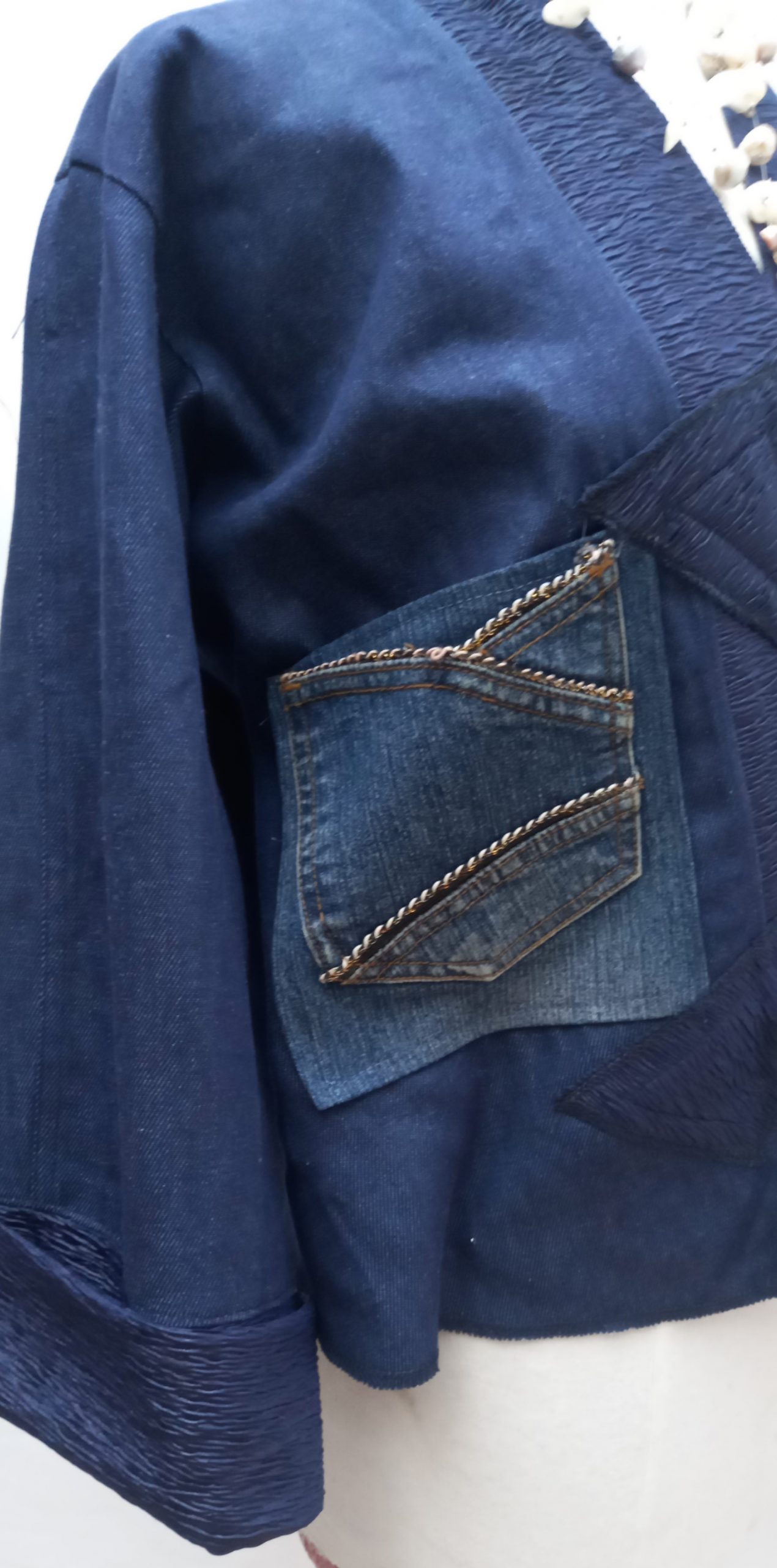 Connie…is short denim jacket , 100% cotton . The jacket has a kimono sleeve and a handpainted one button closure.. It is a composite of viscose , cotton with original jean pockets.It is a one of a kind accent piece.