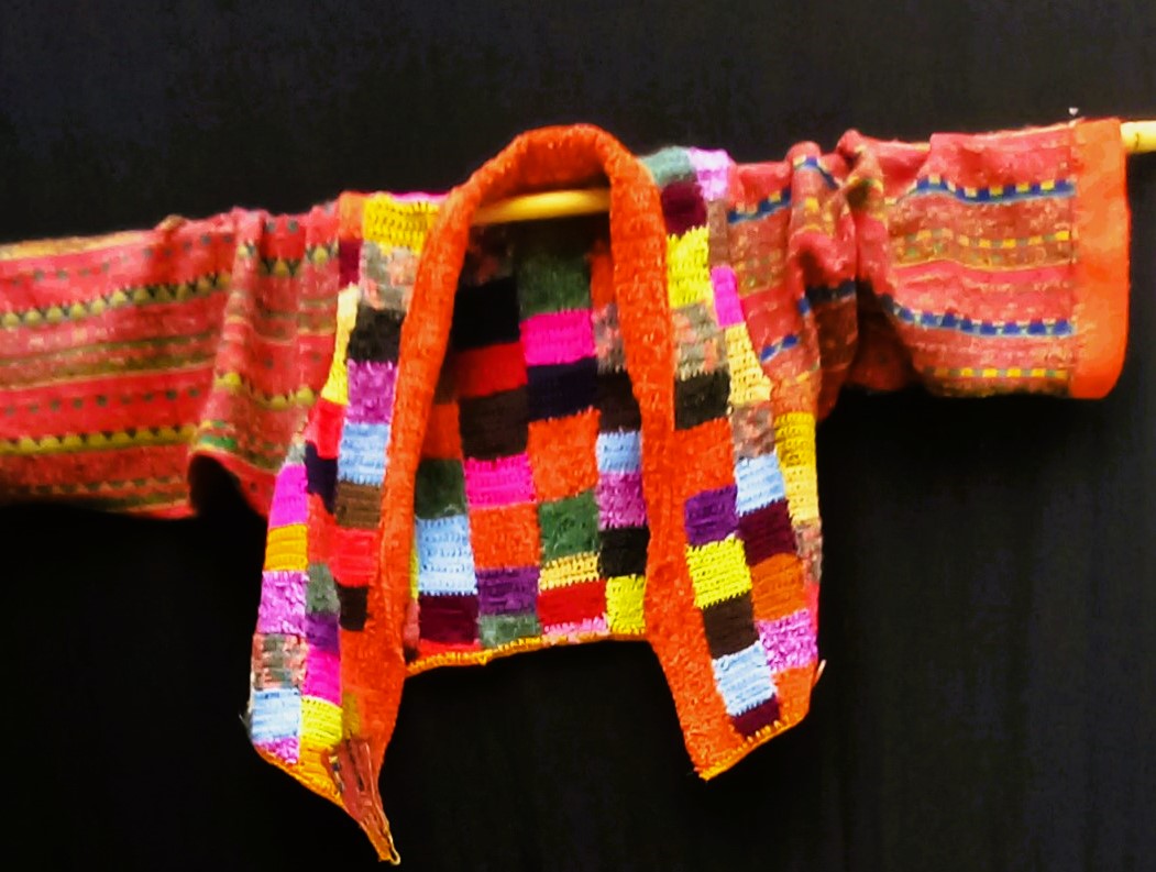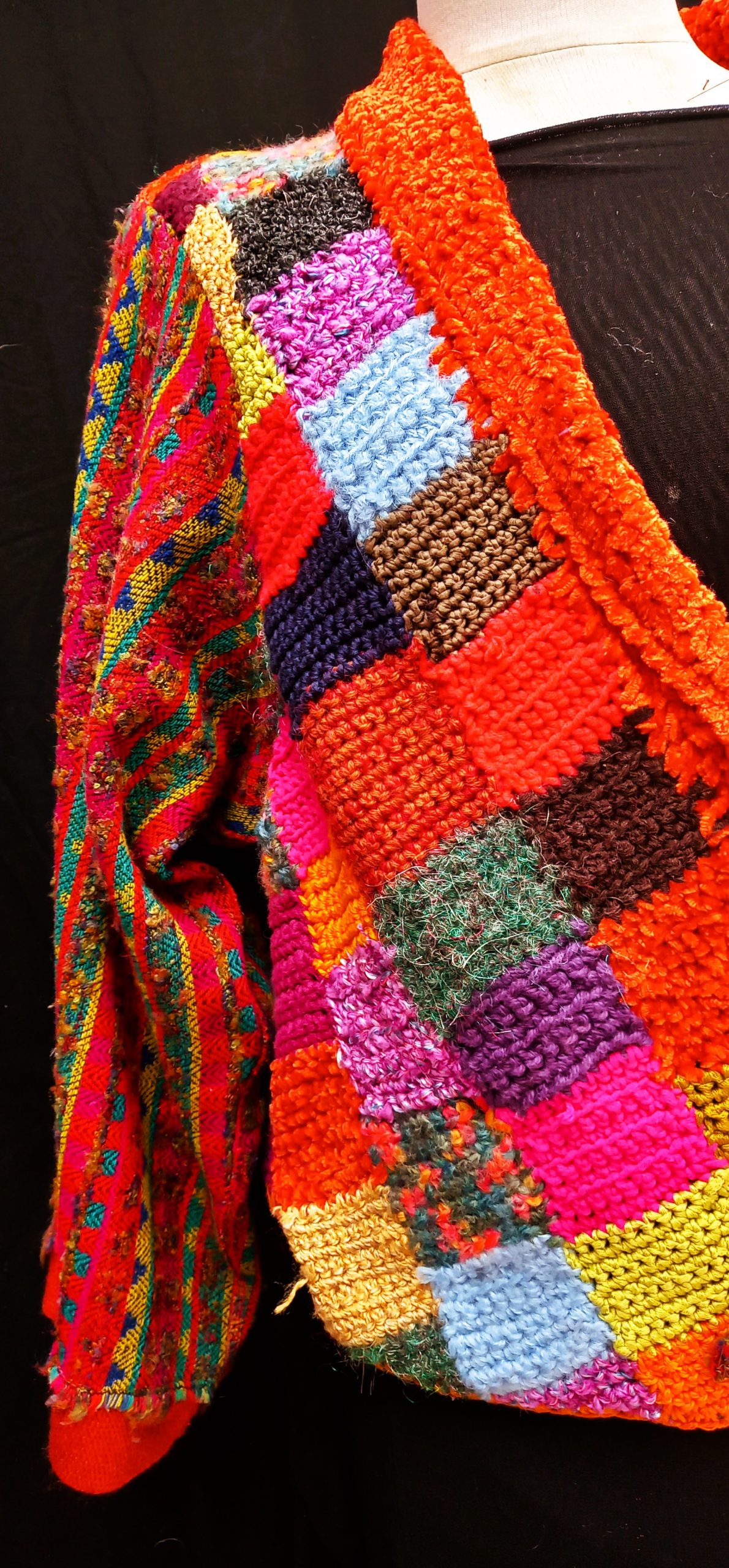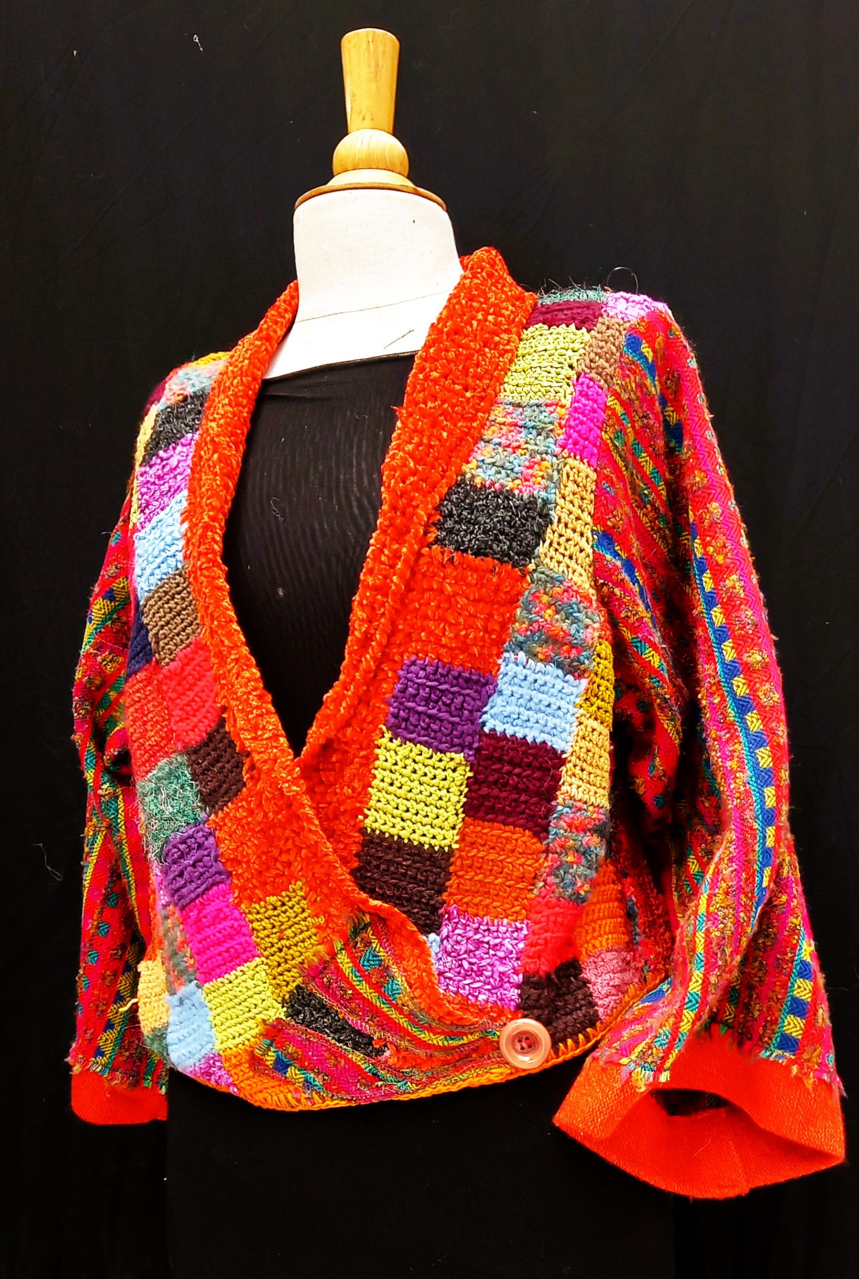 Debra …is a colourful Tv jacket. It is a-one- of- a- kind composition of handcrochet cottons and wools with a woven Kimono sleeve.A handsome accent jacket that you would want to keep forever..