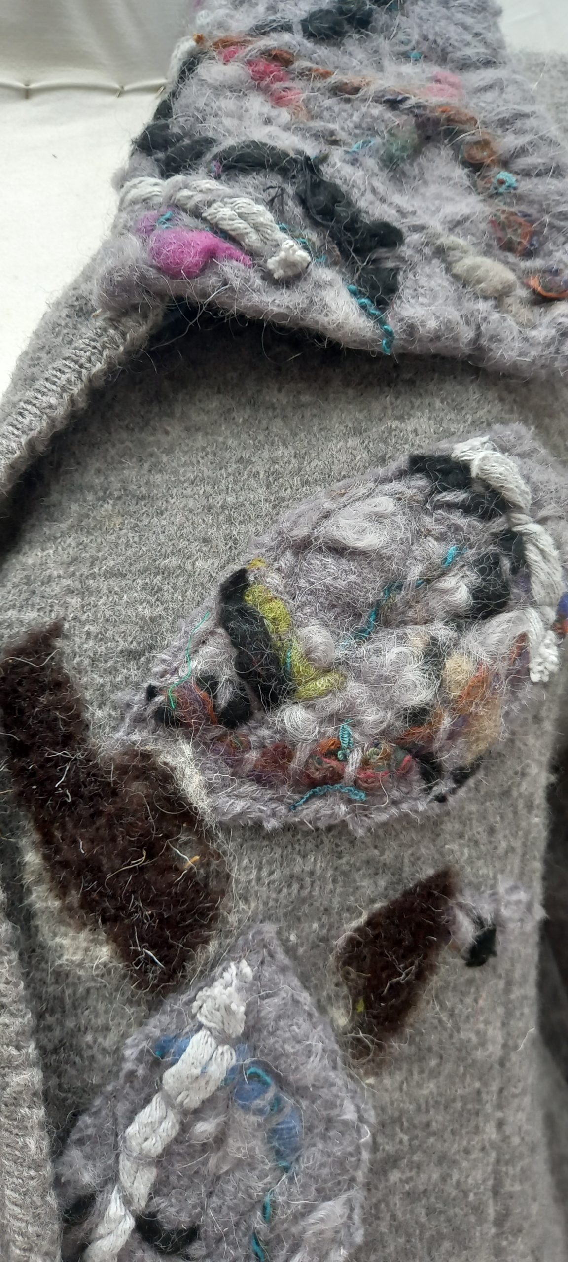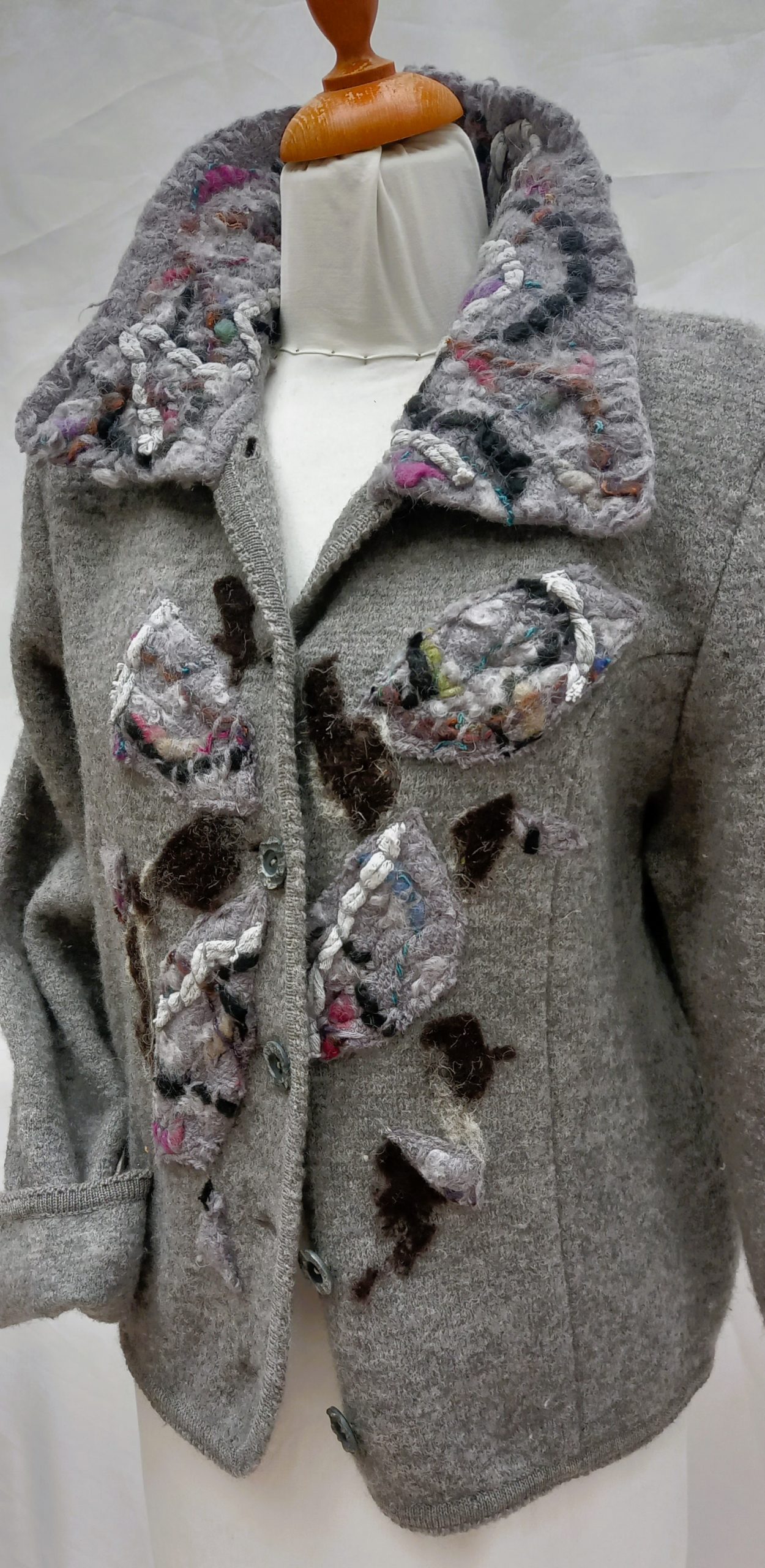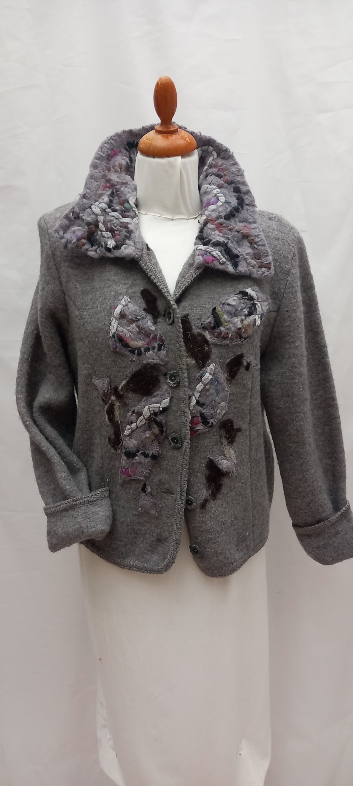 Lana…is a silver gray hip length jacket with a princess line cut.. The jacket has special appliqué felted pieces in the front and collar.