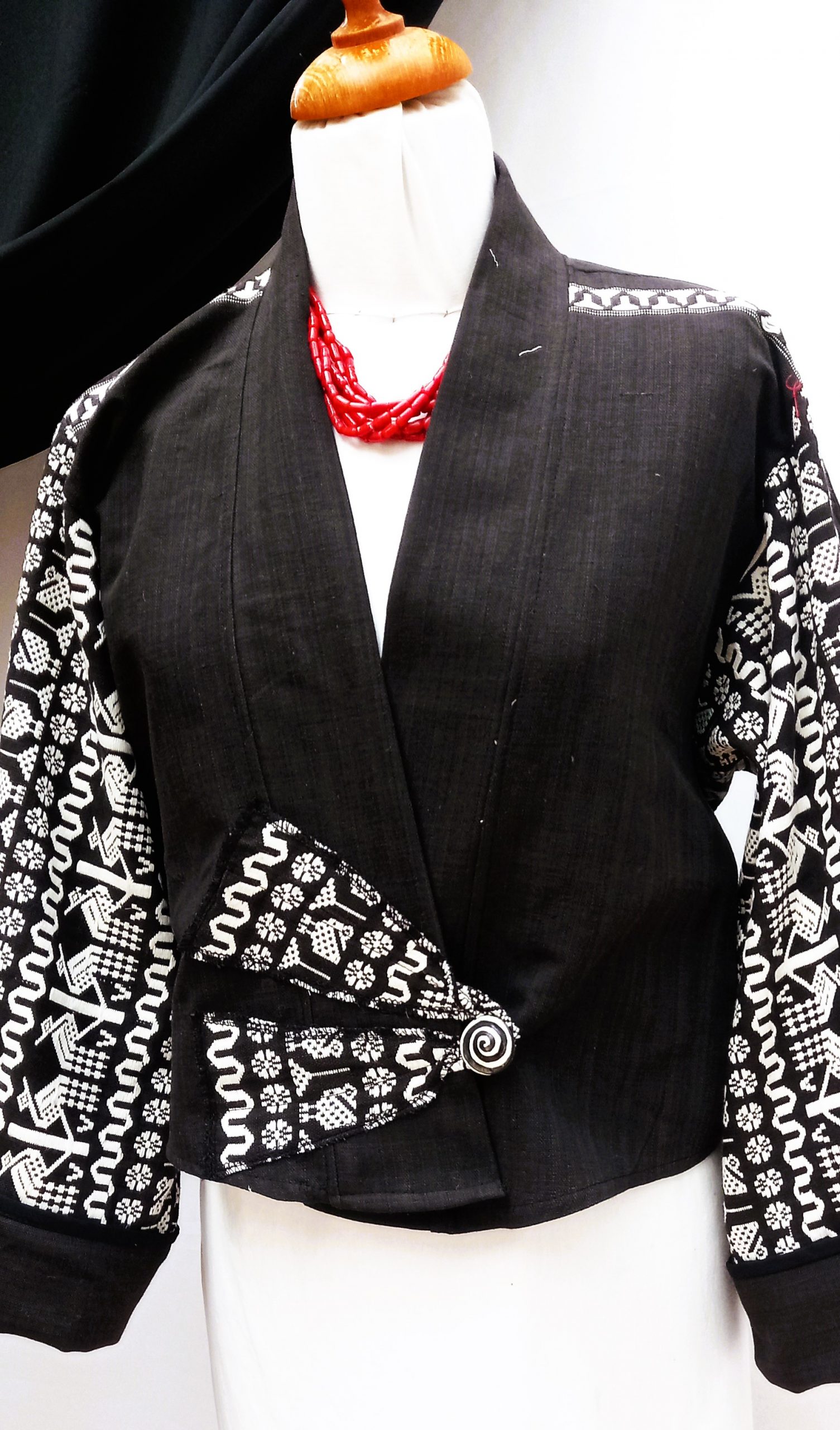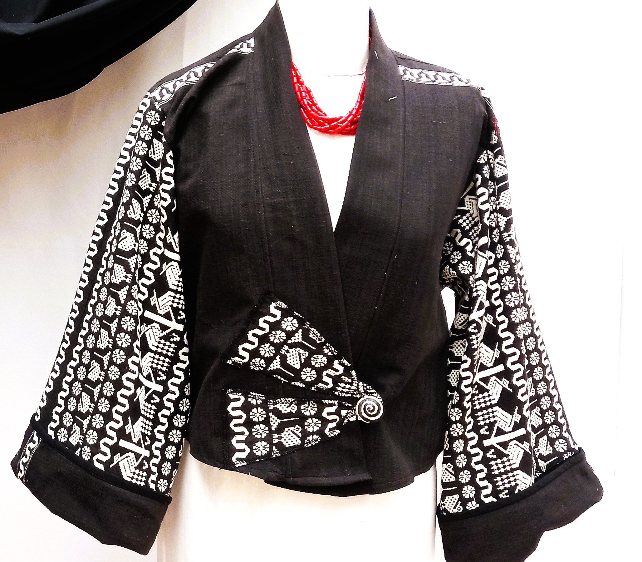 Leana…is a short waisted Kimono jacket. It is 100%cotton handwoven in Guatemala, a special one of a kind piece, a perfect accessory to anything black ..