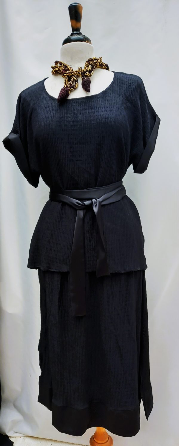 Marcie… is a midnight black 2-piece outfit with a tunic ,skirt and self belt. It is a broompleated viscose blend. The tunic has a drop shoulder sleeve and a u neck, the skirt has an elastic waist with a satin hem. The belt gives it additional fitting.