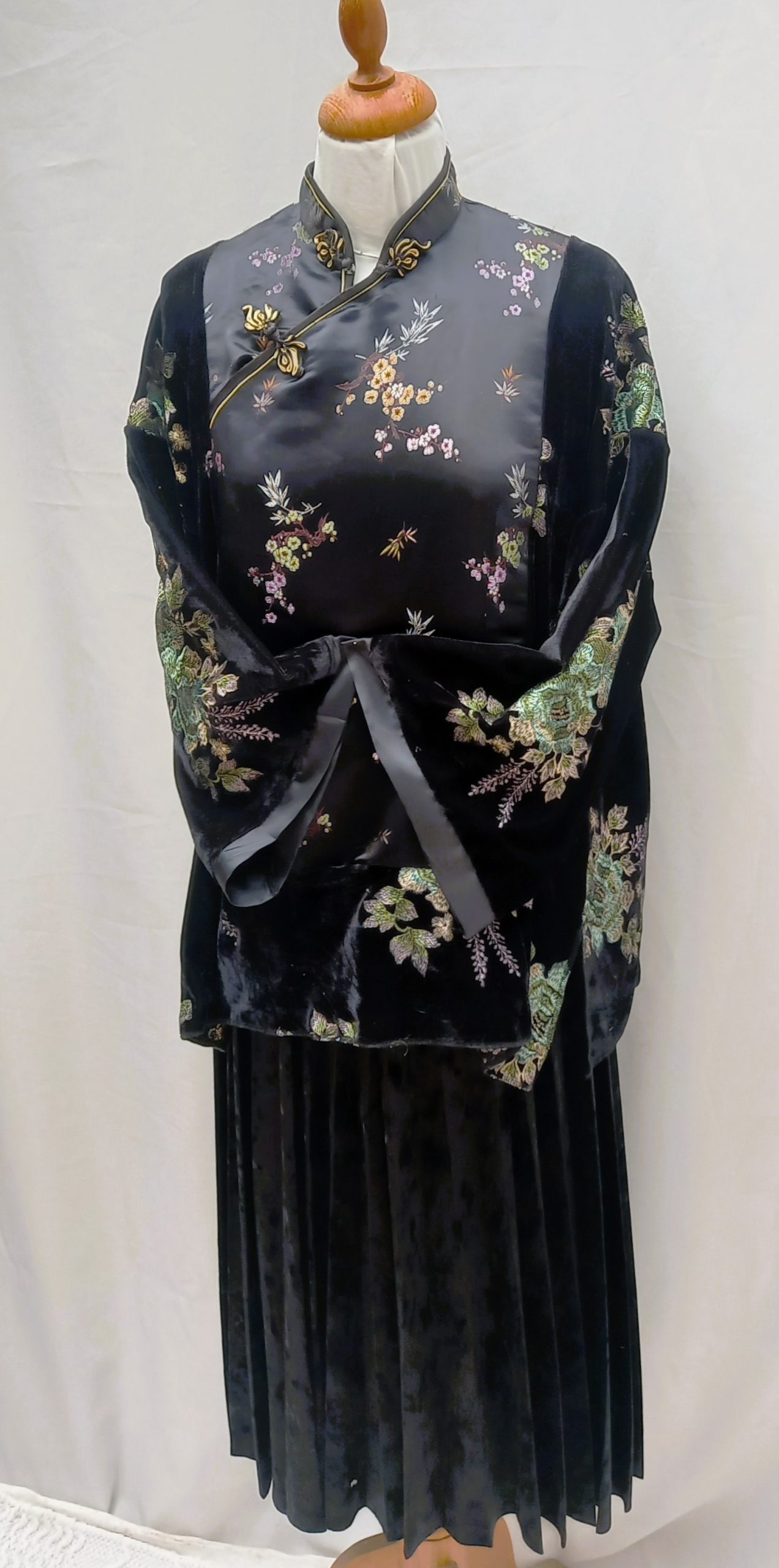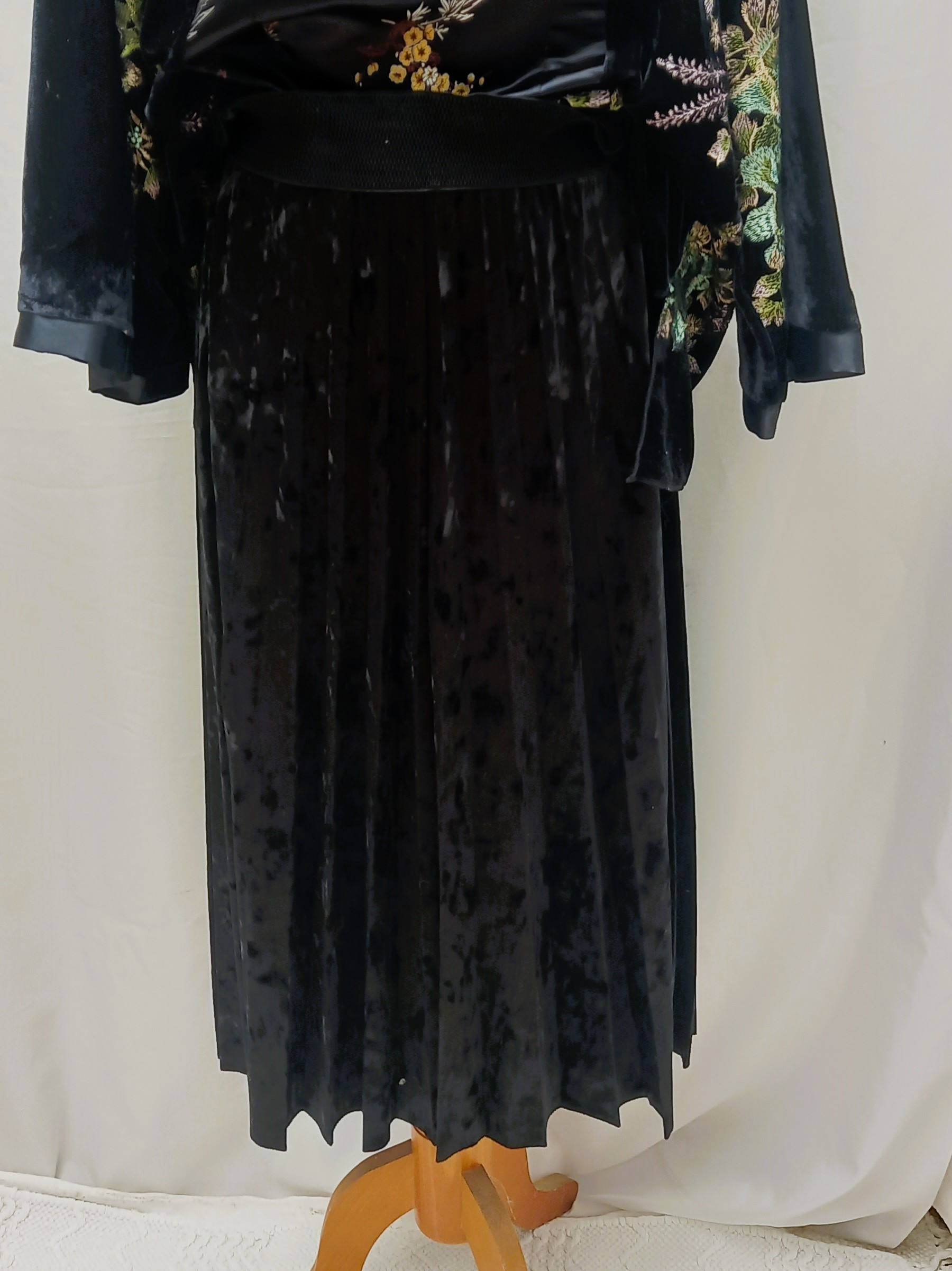 Marian..is a vintage composition , a patchwok with velvet combined into a viscose vintage top. The skirt is a pleated velvet with an elastic waist, a beautiful outfit to take you anywhere
