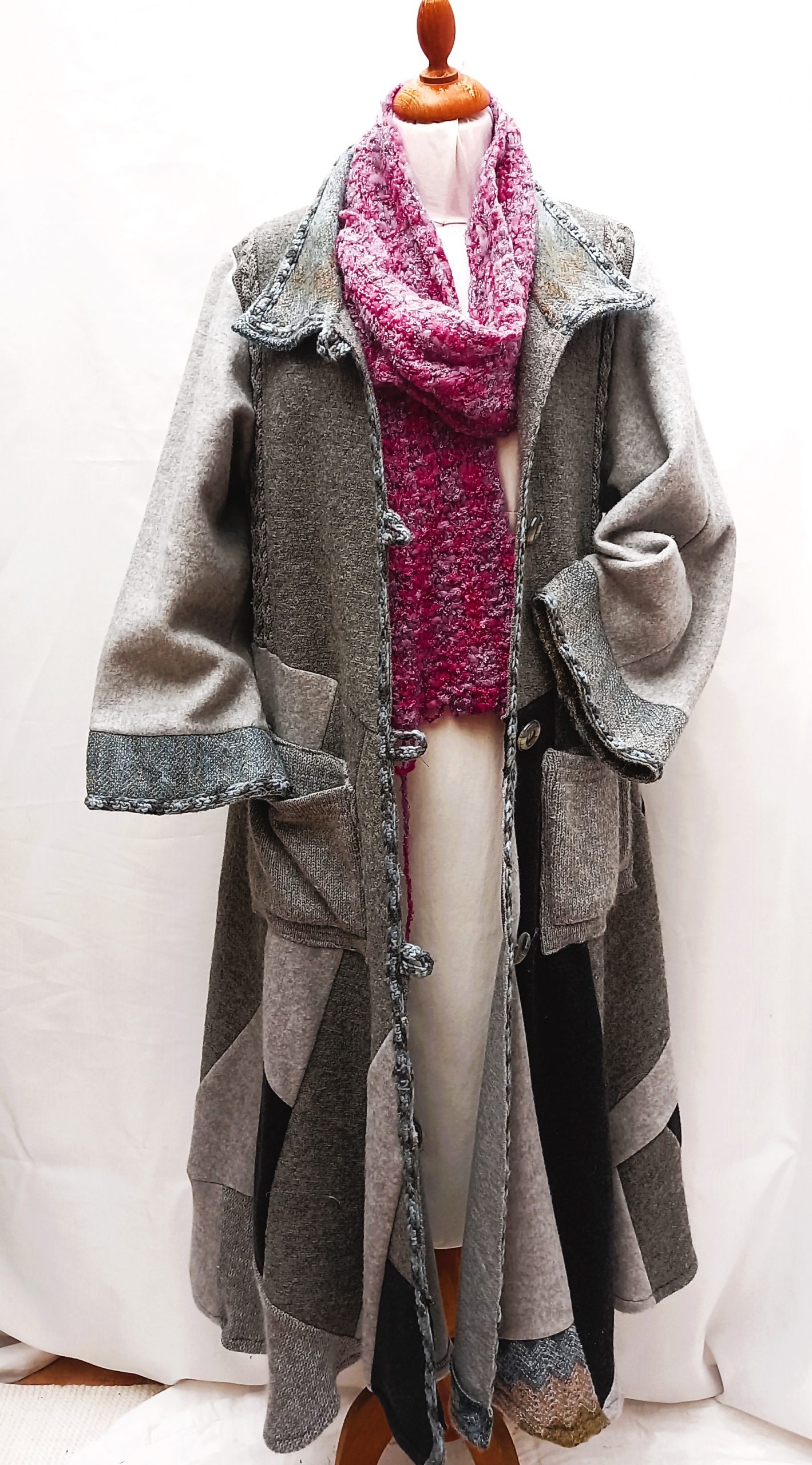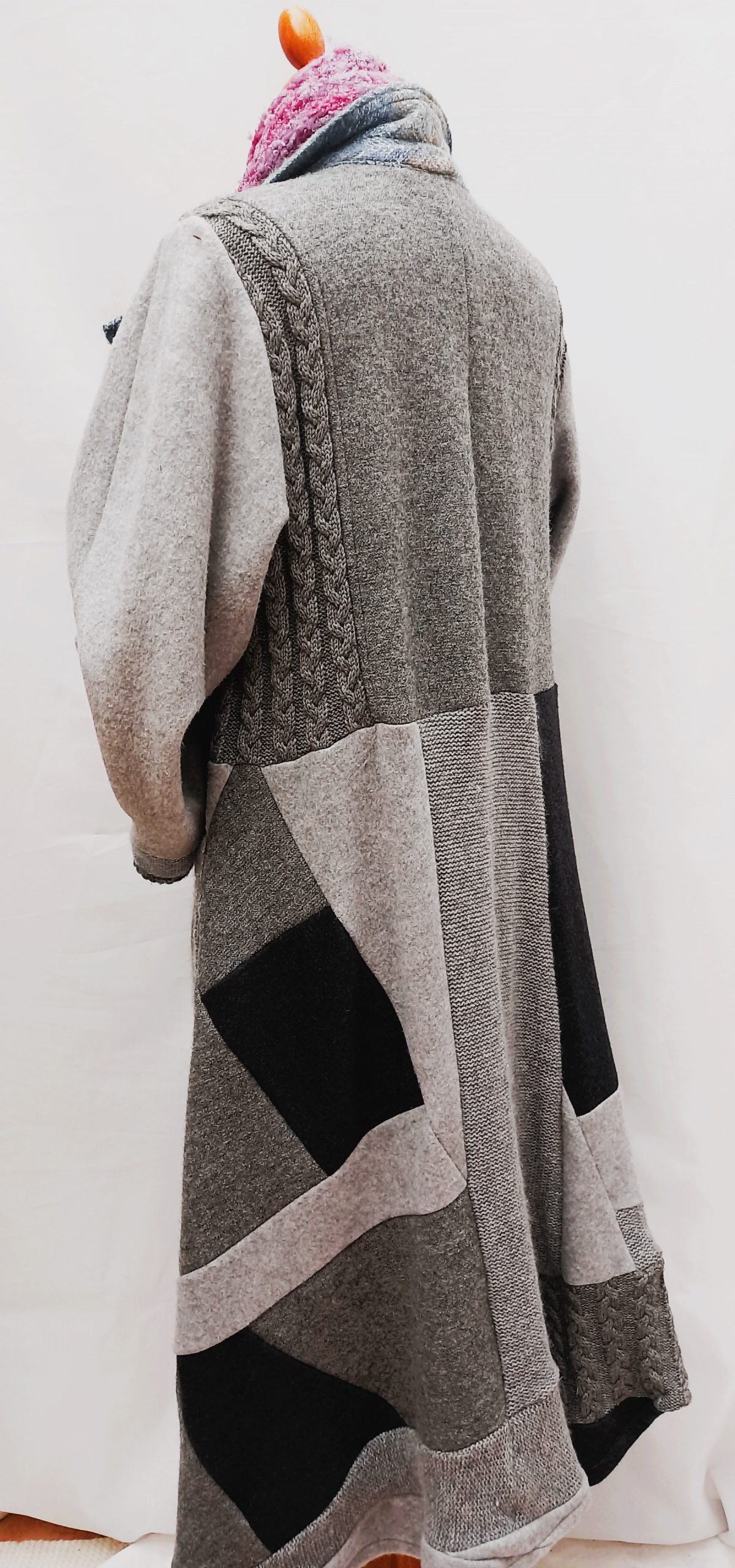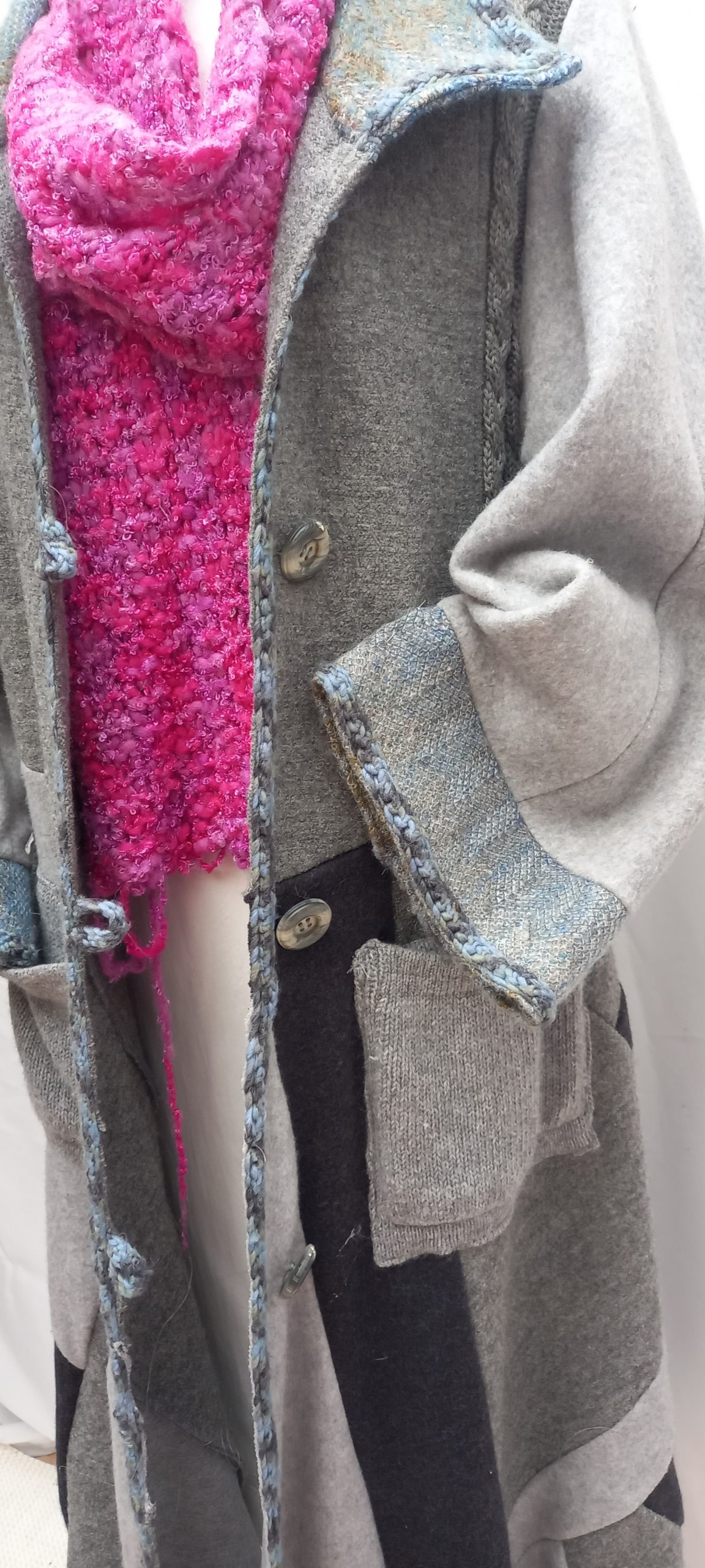 Marlene…is an A-line maxi coat . It is a composition of felted wools and knits. The gray patchwork coat has a collar and a front closure with 5 buttons with a light blue trim.