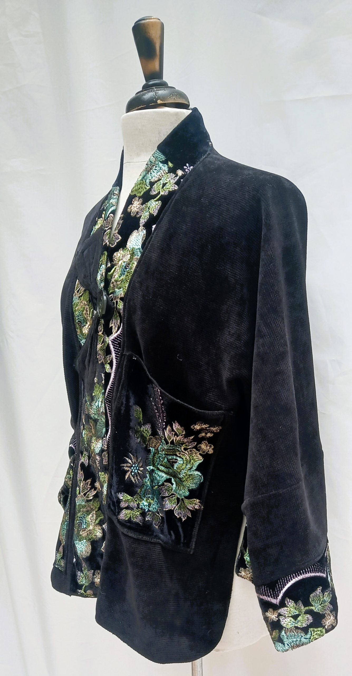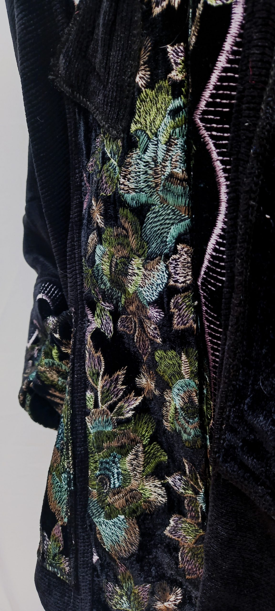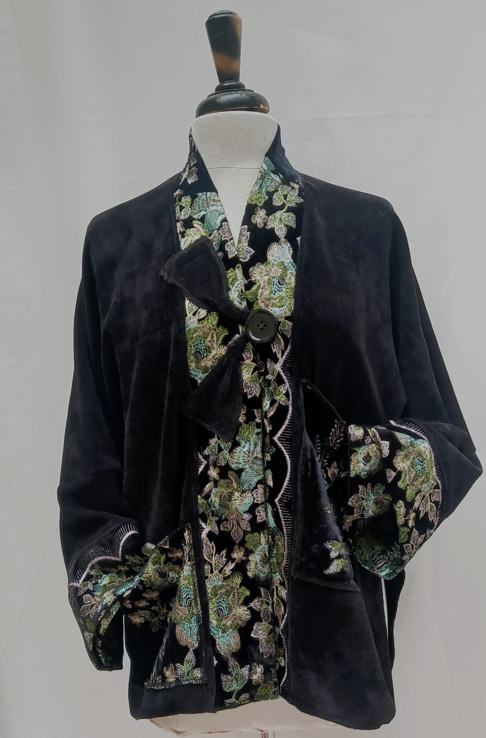 Melissa…is a one/of /a kind midnight black accent jacket. It is a kimono style , viscose velvet embroidered with a floral motive. The jacket has 2 frontal pockets , a handsome piece to take you anywhere.