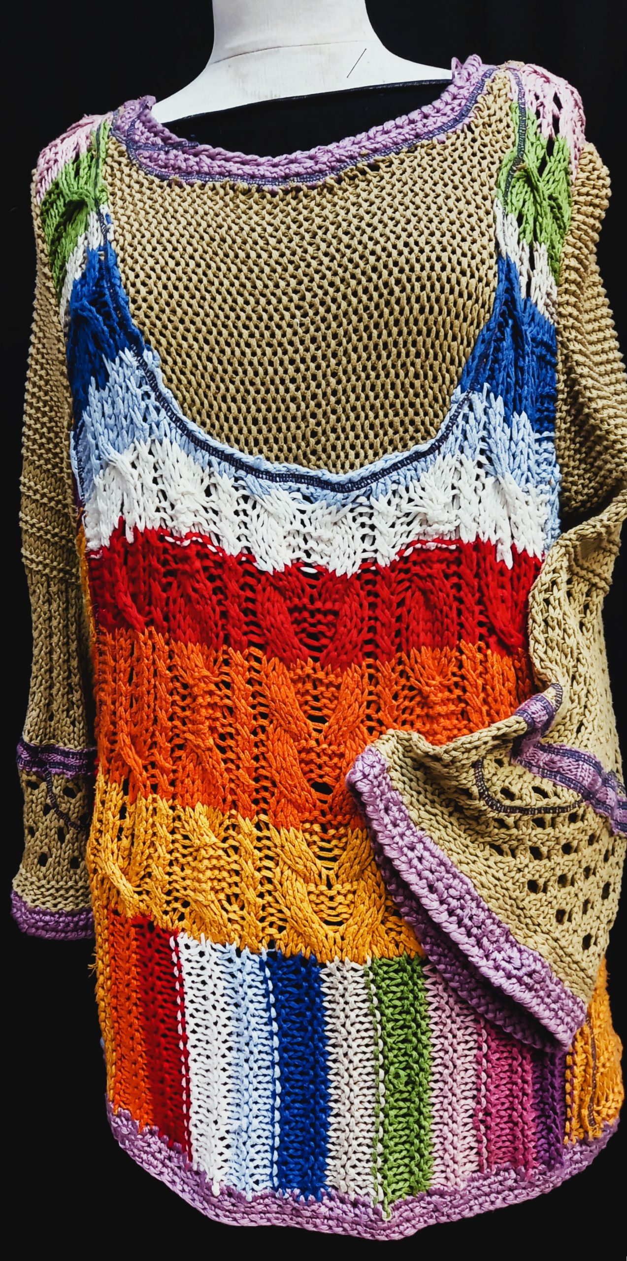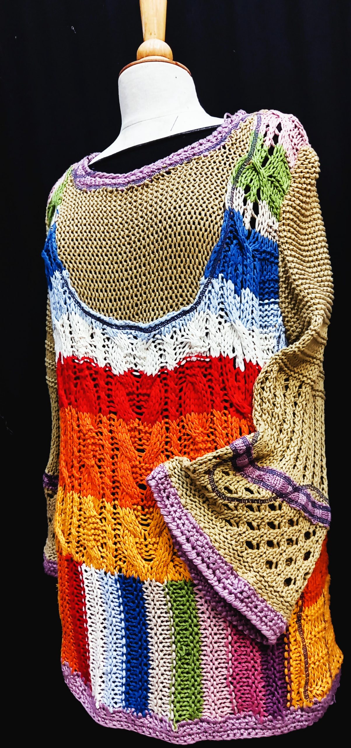 Sandra..is a colourful handknit tunic., a statement piece . It is a one-of -a kind composite , 100% cotton and perfect look to wear with leggings.
