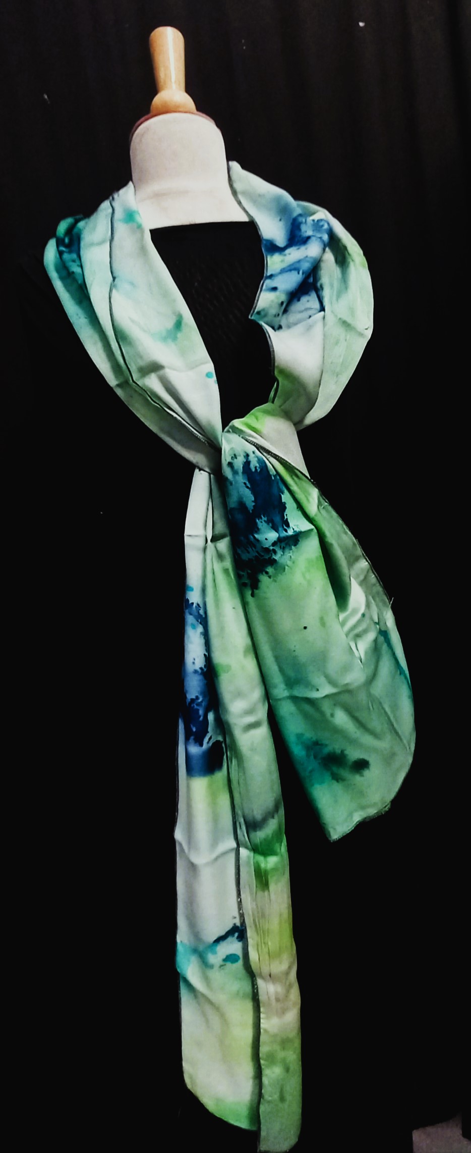 scarf…the extra long turqoise scarf is a statement piece. It is silk satin and handpainted in gorgeous cool clours. a one of a kind piece.