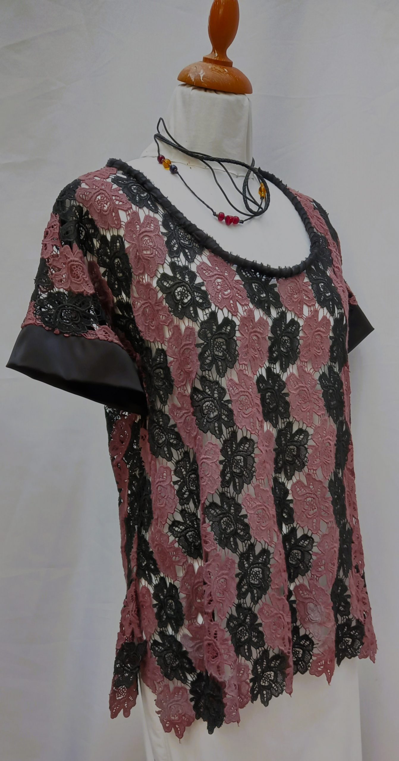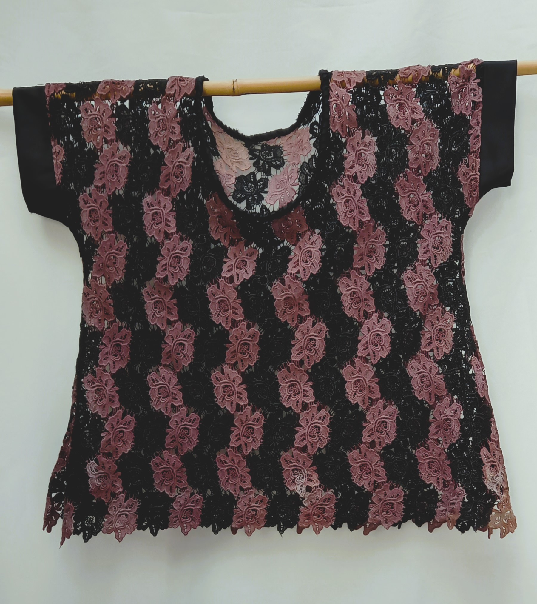 Serena..is a handpainted drop shoulder sleeve top . It is cotton lace with satin trim.The neckline is handfinished a very special piece to accent your wardrobe.