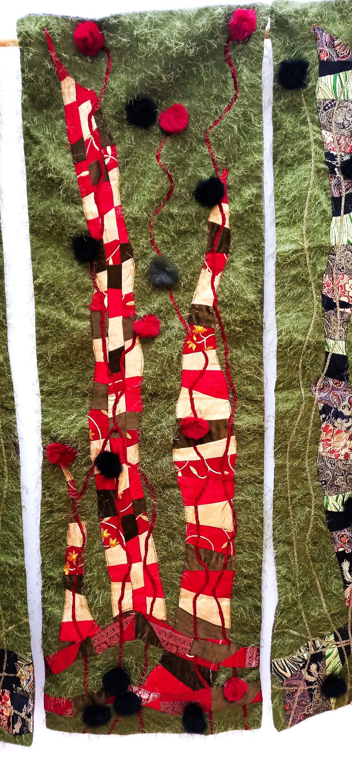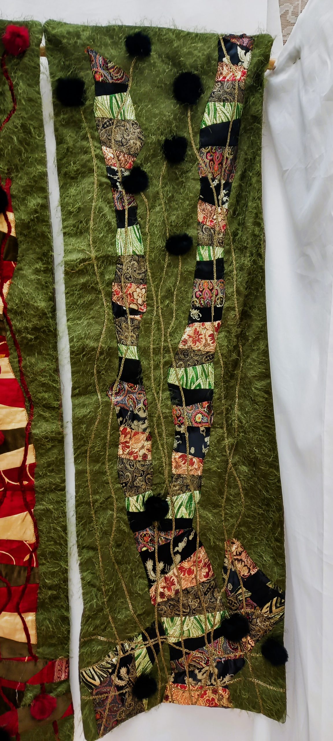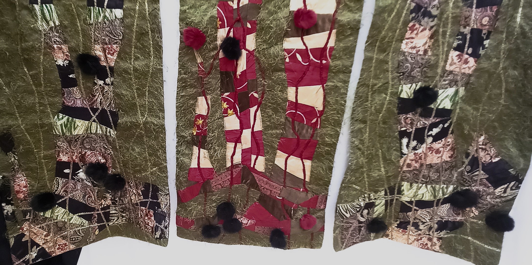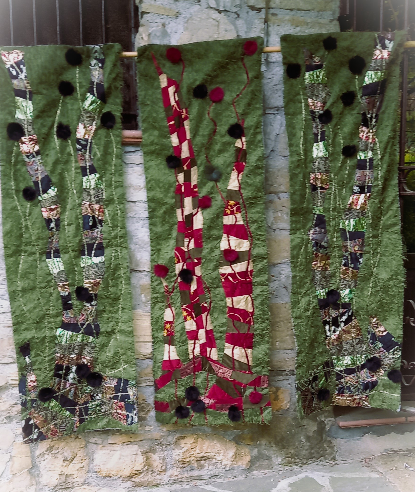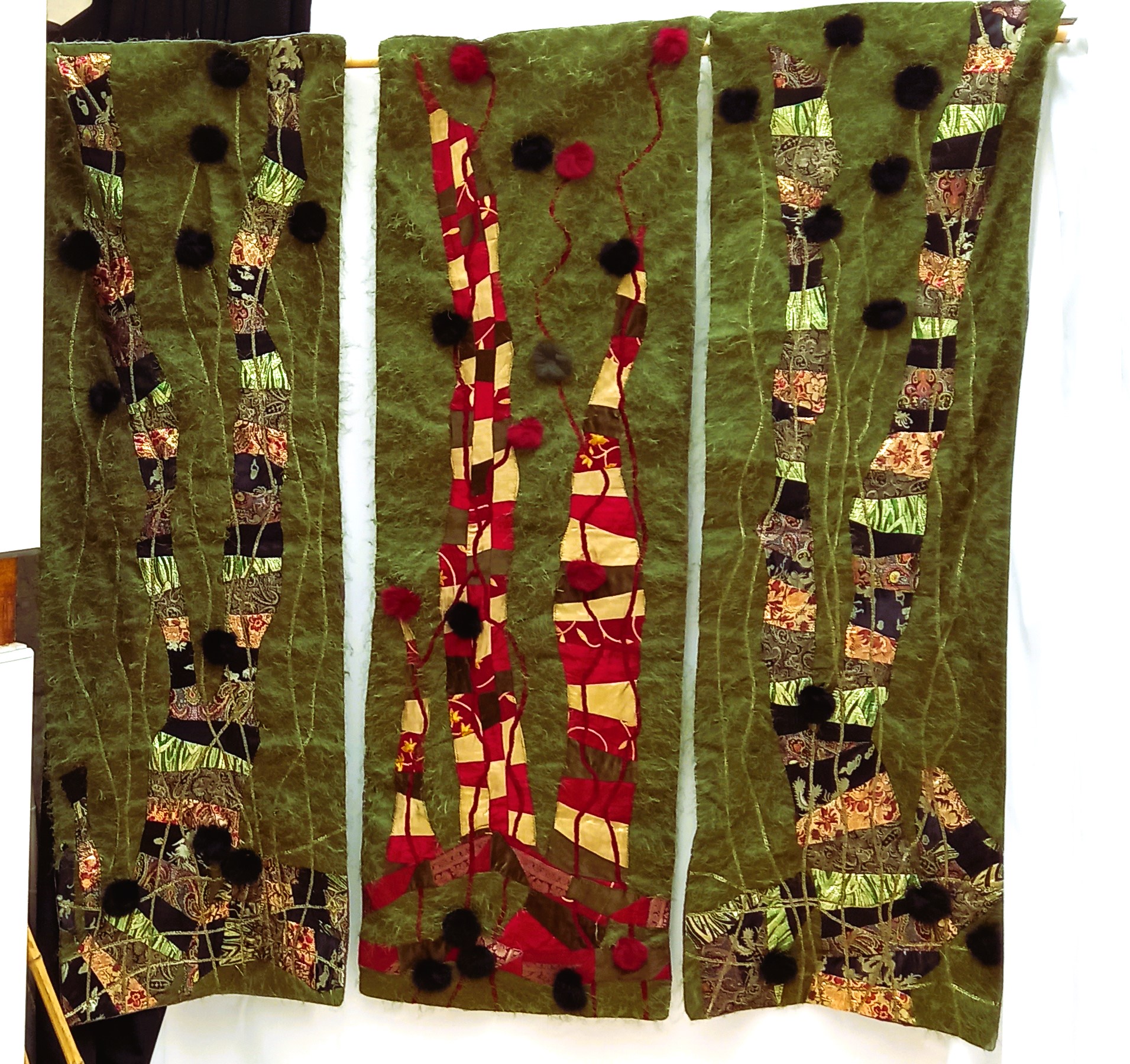 Three Panels…I was enjoying myself while creating this unique wallhanging. It consists of 3 individual panels of patchwork appliqued on a verdigris green background. The panels have viscose satin quilted lining and a sleeve for hanging.
